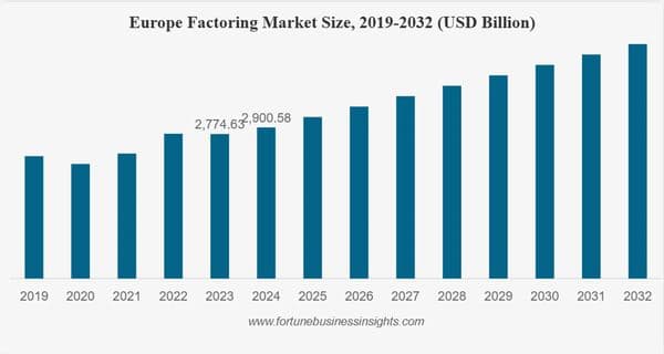 世界のファクタリング市場規模は好調に推移しており、2032年までに7兆ドルを突破すると言われています。特に、欧州のファクタリング市場は拡大しており、世界の6割以上を占めている状況です。