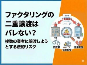 ファクタリングの二重譲渡はバレない?複数の業者に譲渡しようとする法的リスク ファクタリング取引において、既に譲渡済みの売掛債権を事実を隠蔽して別のファクタリング会社へ重ねて譲渡する行為(二重譲渡)は、我が国の現行法制度および金融実務...
