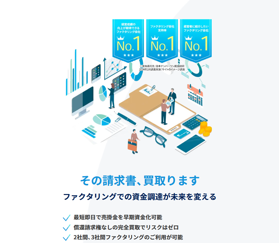 請求書と通帳のコピーの2点だけで最短2時間即日入金が目指せます。