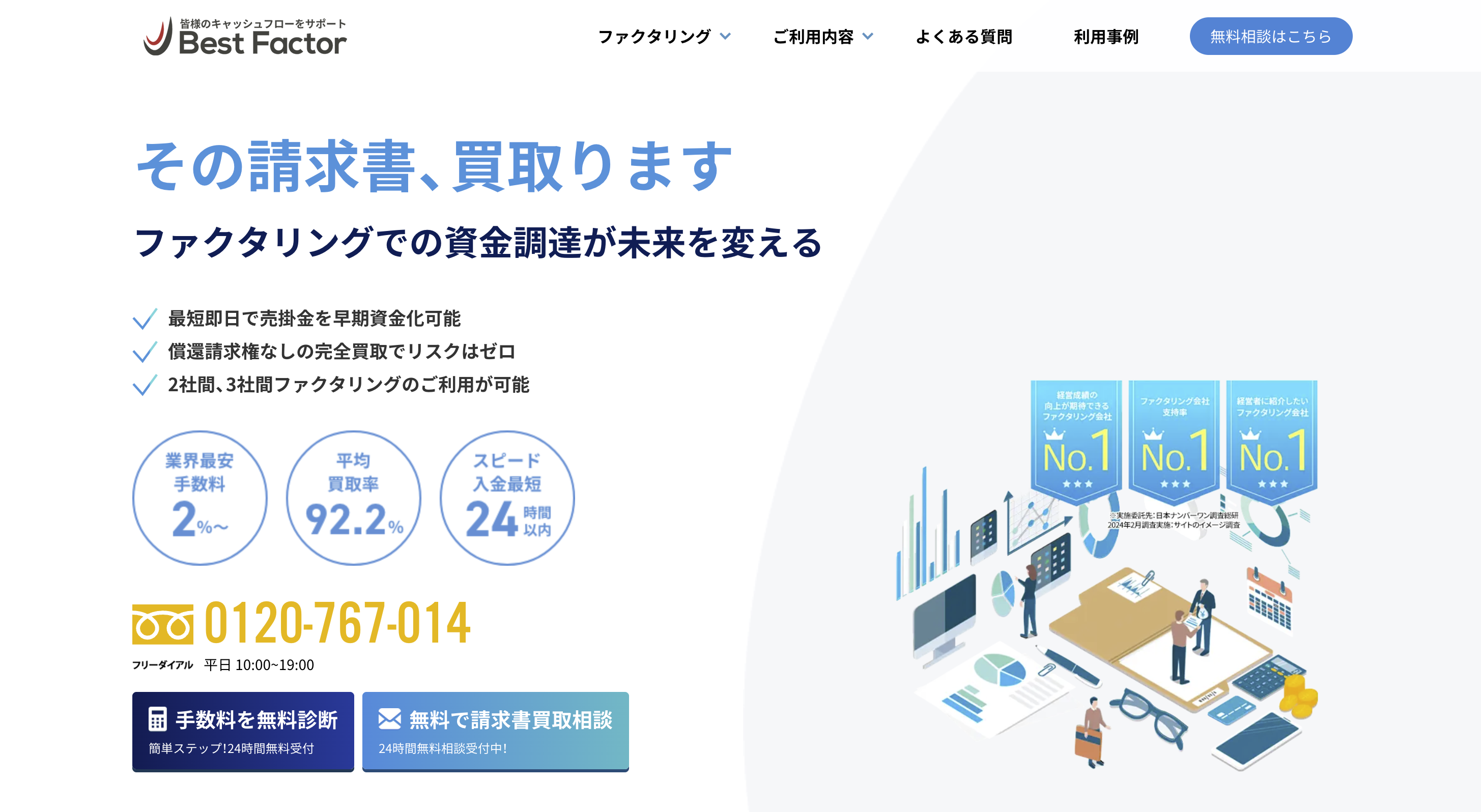 ベストファクターの営業時間は「平日 10:00〜19:00」となっています。この時間内であれば、電話での無料相談や最短即日での審査・資金調達の対応が可能です。なお、Webからの簡易診断やメール相談自体は随時可能です。