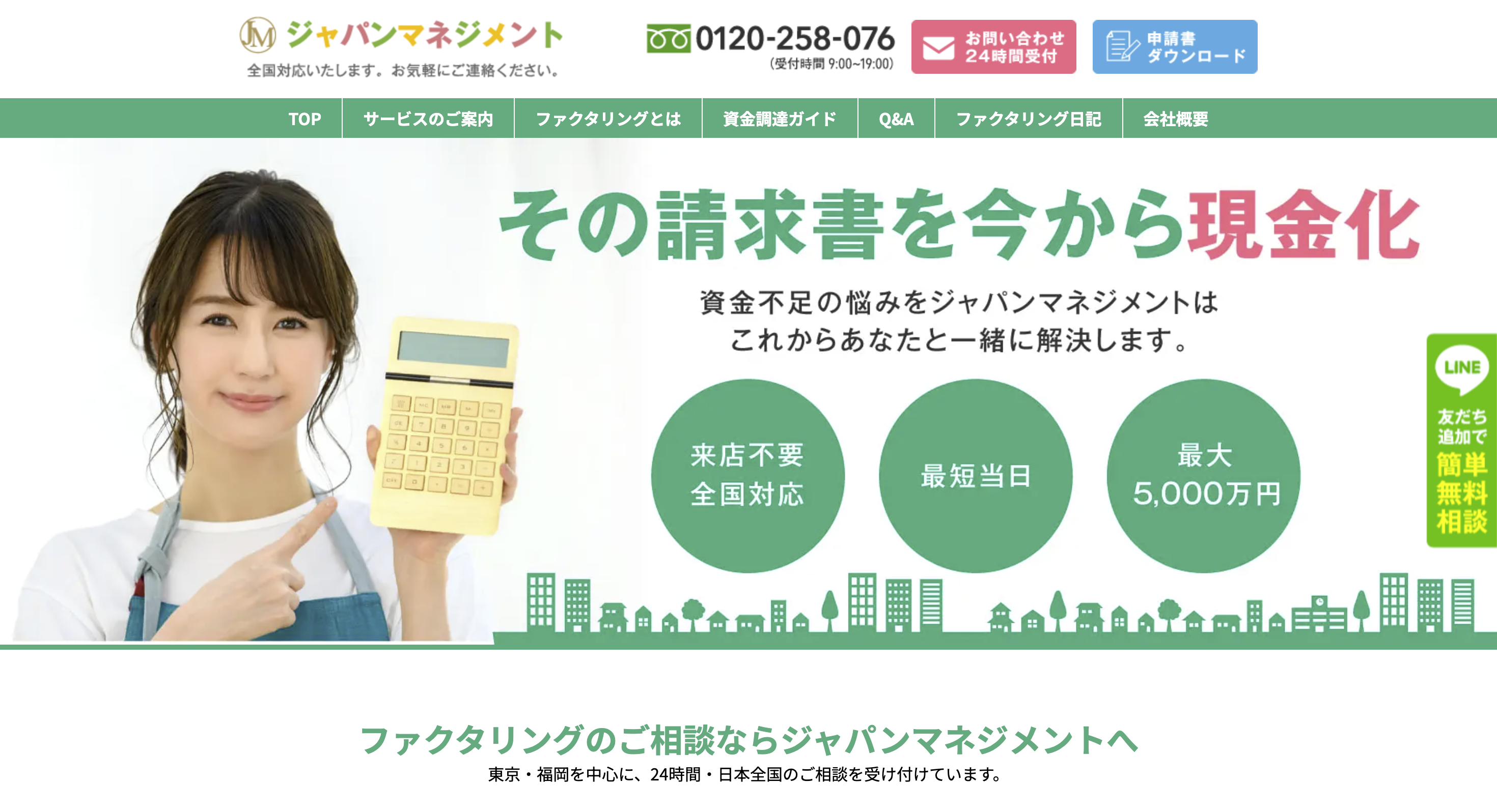 ジャパンマネジメントは、株式会社ラインオフィスサービスが運営するファクタリングサービスです。福岡と東京の2拠点を中心に全国出張対応を行っており、地方の企業でも利用しやすいのが特徴です。2社間・3社間のファクタリングに加え、診療報酬や介護報酬などの医療債権にも対応しています。また、買取金額は50万円から最高5,000万円まで幅広く設定されており、最短1日でのスピーディーな資金調達を実現しています。経営コンサルティング事業も手掛けているため、中長期的な財務改善の相談ができる点も多くの利用者から評価されています。